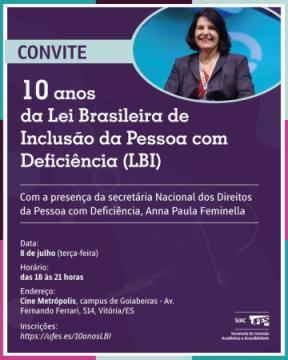 O evento integra a programação institucional de celebração pelos dez anos da Lei Brasileira de Inclusão da Pessoa com Deficiência (Lei nº 13.146/2015) e contará com a presença da Secretária Nacional dos Direitos da Pessoa com Deficiência, parlamentares, gestores, movimentos sociais, órgãos do sistema de justiça e representantes da comunidade acadêmica.