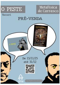 O romance do Prof. Vitor Cei é ilustrado por Marcio Vaccari, que está lançando o livro O Peste. A obra, coeditada e prefaciada por Cei, reúne cerca de 200 cybercharges coloridas criadas entre 2018 e 2025, configurando um testemunho visual e ácido de um período grotesco da política brasileira. O posfácio é da doutoranda Hellen Cesário (PPGL-Ufes), autora da dissertação Sátira política e literatura em cybercharges de Marcio Vaccari (2019-2022).